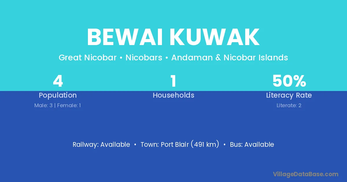 Port Blair (491 km) is the nearest town to Bewai Kuwak village for major economic activities and is located approximately 491 km away.