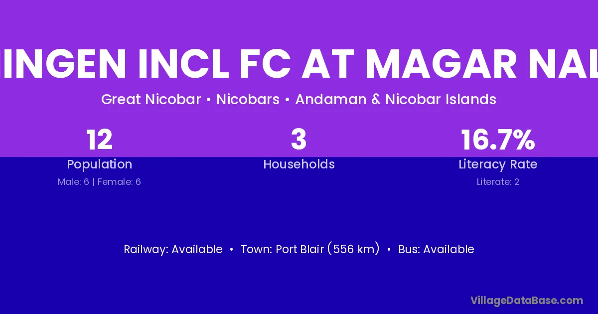 Chingen Incl Fc At Magar Nalla village has a total population of 12 people, of which 6 are males and 6 are females.