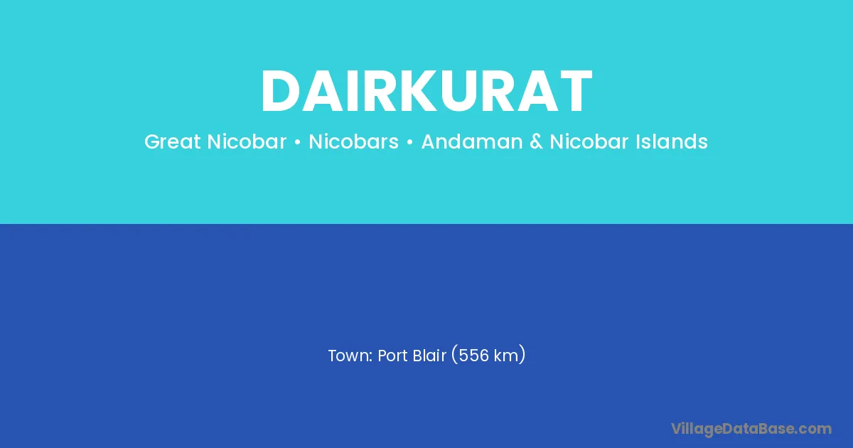 Port Blair (556 km) is the nearest town to Dairkurat village for major economic activities and is located approximately 556 km away.