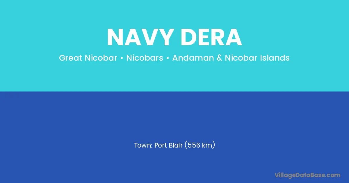 Port Blair (556 km) is the nearest town to Navy Dera village for major economic activities and is located approximately 556 km away.