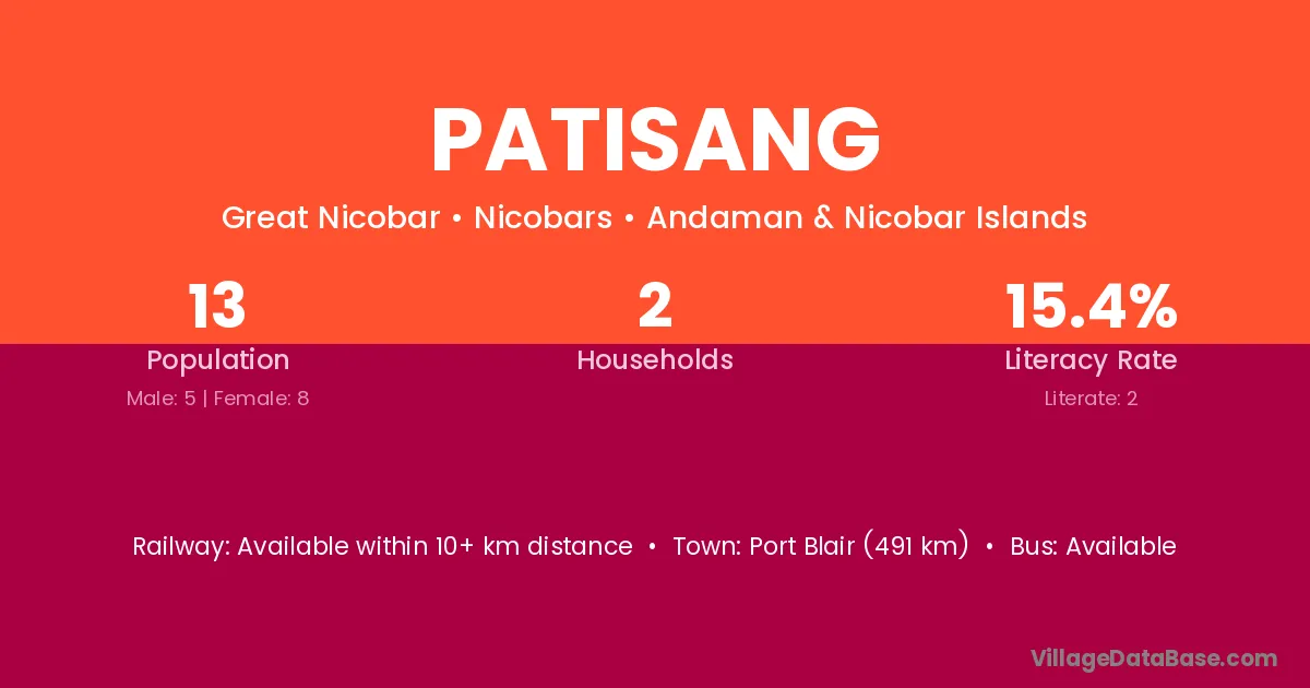 Port Blair (491 km) is the nearest town to Patisang village for major economic activities and is located approximately 491 km away.
