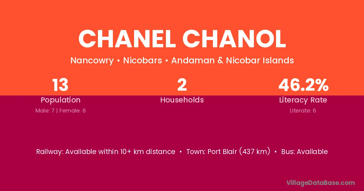 Port Blair (437 km) is the nearest town to Chanel Chanol village for major economic activities and is located approximately 437 km away.