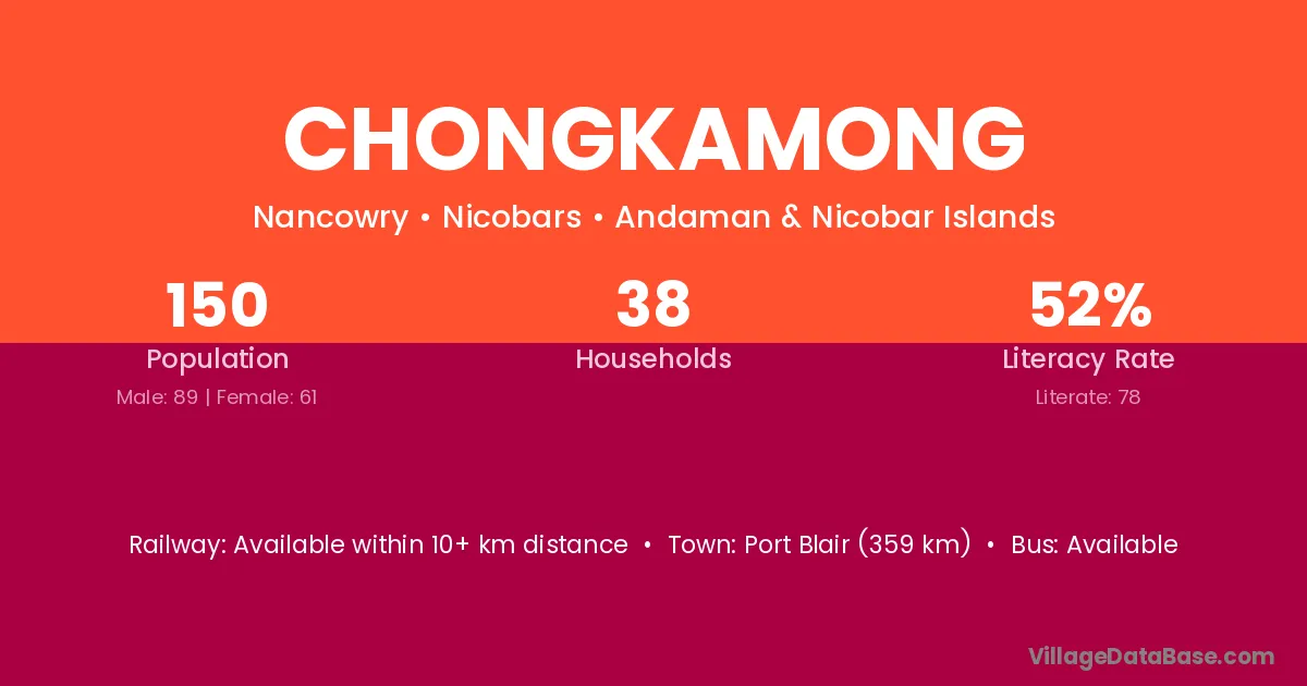 Port Blair (359 km) is the nearest town to Chongkamong village for major economic activities and is located approximately 359 km away.