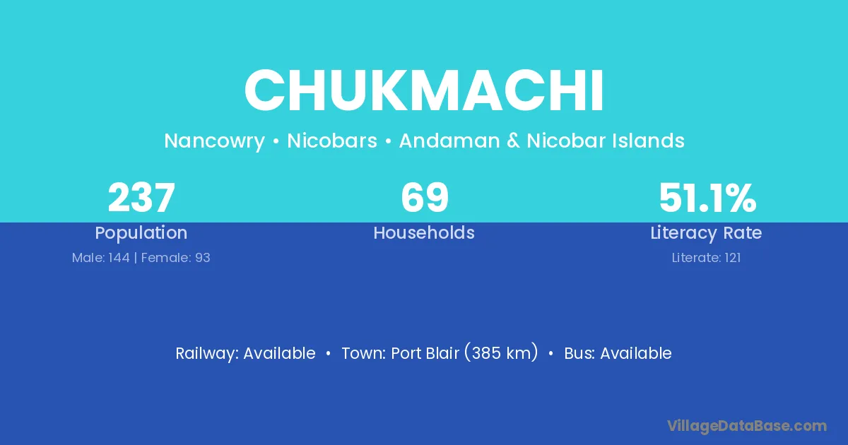 Port Blair (385 km) is the nearest town to Chukmachi village for major economic activities and is located approximately 385 km away.