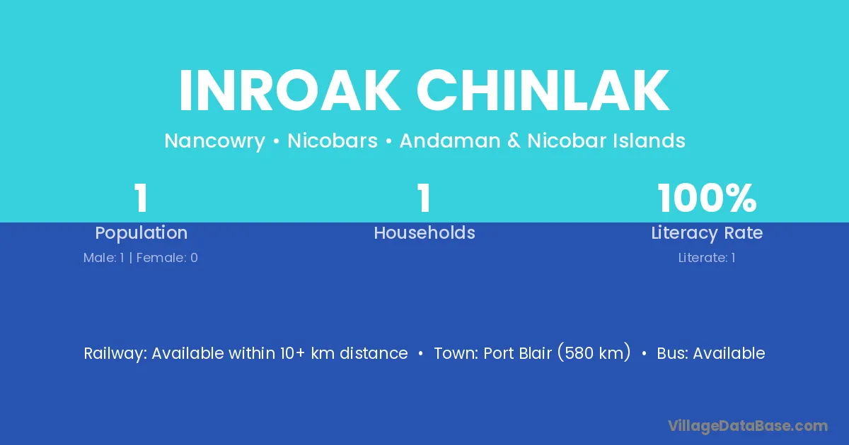 Port Blair (580 km) is the nearest town to Inroak Chinlak village for major economic activities and is located approximately 580 km away.