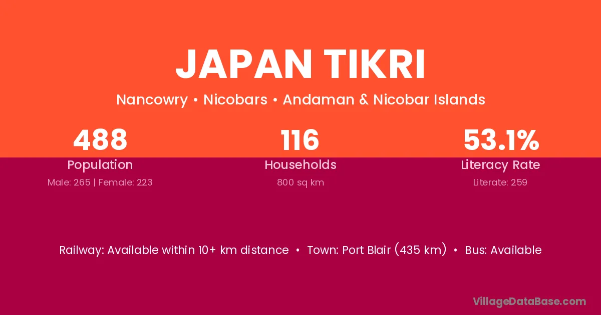 Port Blair (435 km) is the nearest town to Japan Tikri village for major economic activities and is located approximately 435 km away.