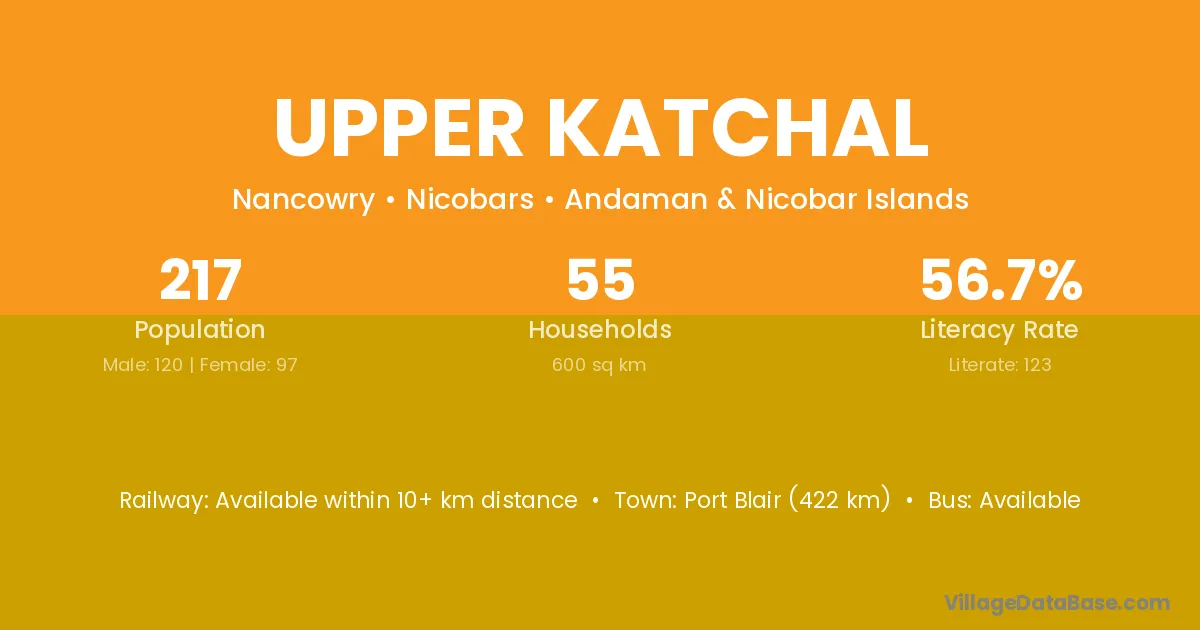 Upper Katchal village has a total population of 217 people, of which 120 are males and 97 are females.