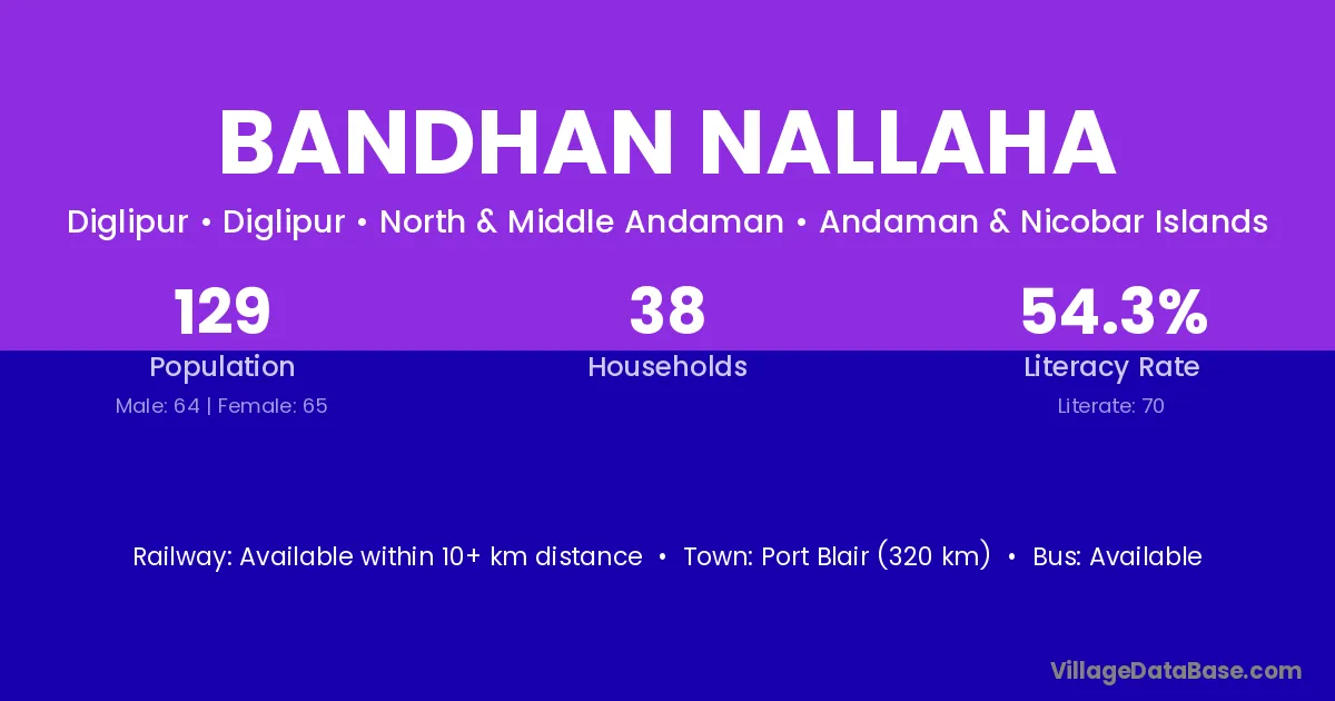 Port Blair (320 km) is the nearest town to Bandhan Nallaha village for major economic activities and is located approximately 320 km away.
