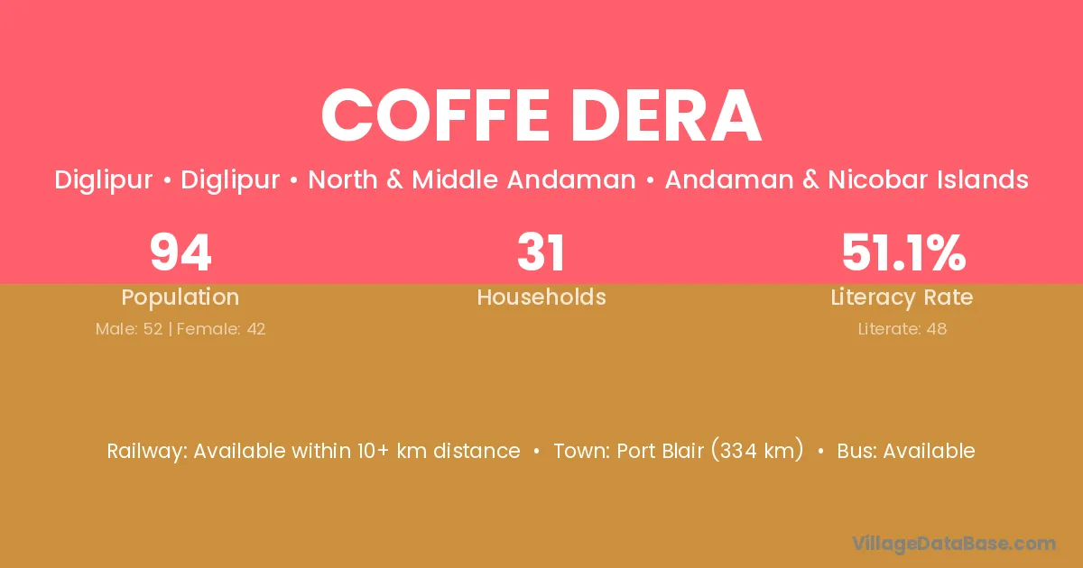 Port Blair (334 km) is the nearest town to Coffe Dera village for major economic activities and is located approximately 334 km away.