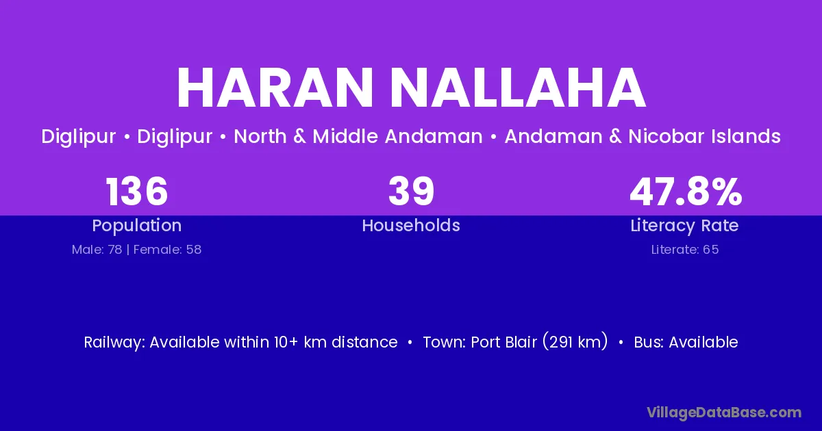 Port Blair (291 km) is the nearest town to Haran Nallaha village for major economic activities and is located approximately 291 km away.