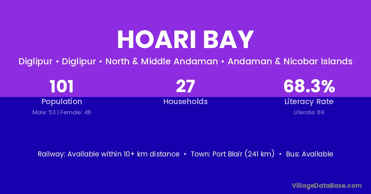 Port Blair (241 km) is the nearest town to Hoari Bay village for major economic activities and is located approximately 241 km away.