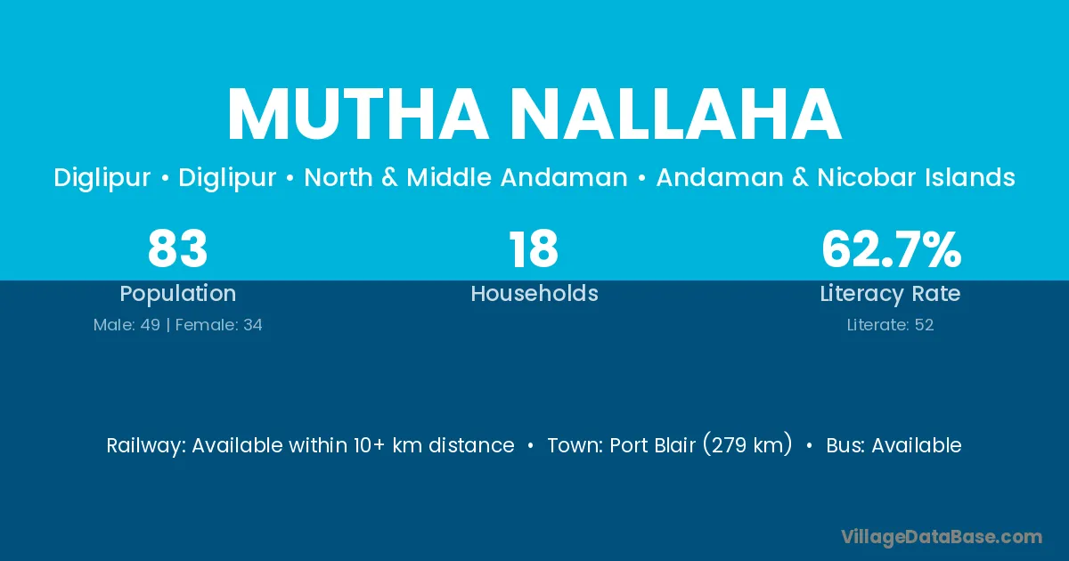Port Blair (279 km) is the nearest town to Mutha Nallaha village for major economic activities and is located approximately 279 km away.