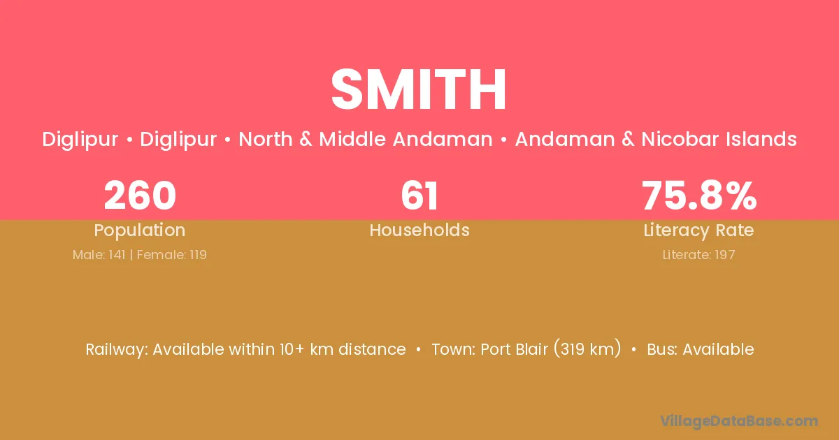 Port Blair (319 km) is the nearest town to Smith village for major economic activities and is located approximately 319 km away.