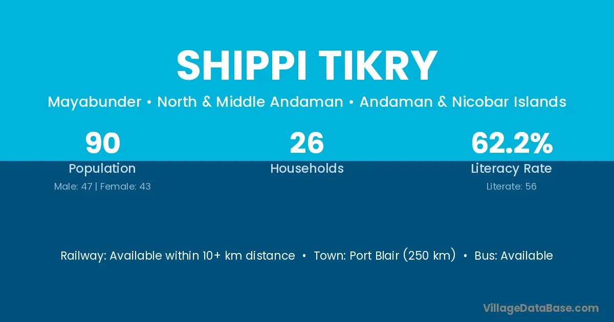 Port Blair (250 km) is the nearest town to Shippi Tikry village for major economic activities and is located approximately 250 km away.