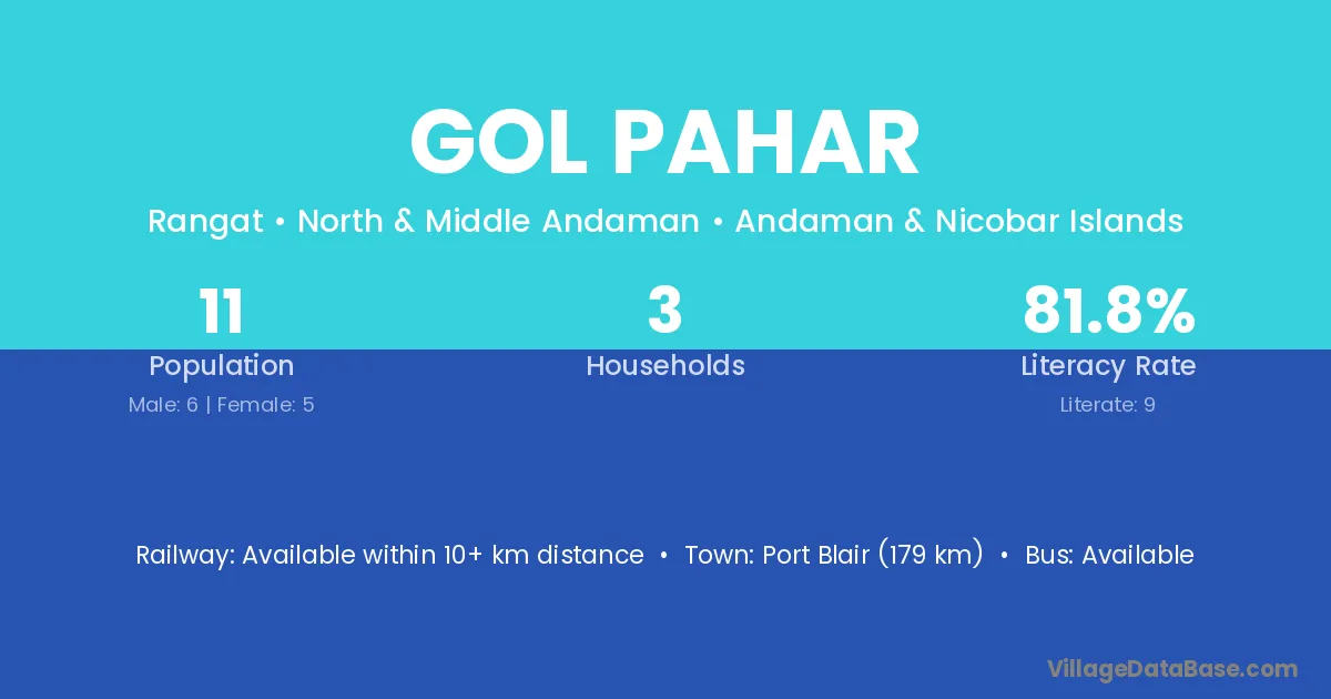 Port Blair (179 km) is the nearest town to Gol Pahar village for major economic activities and is located approximately 179 km away.