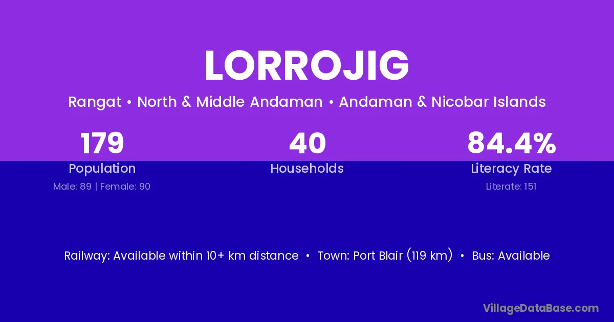 Port Blair (119 km) is the nearest town to Lorrojig village for major economic activities and is located approximately 119 km away.