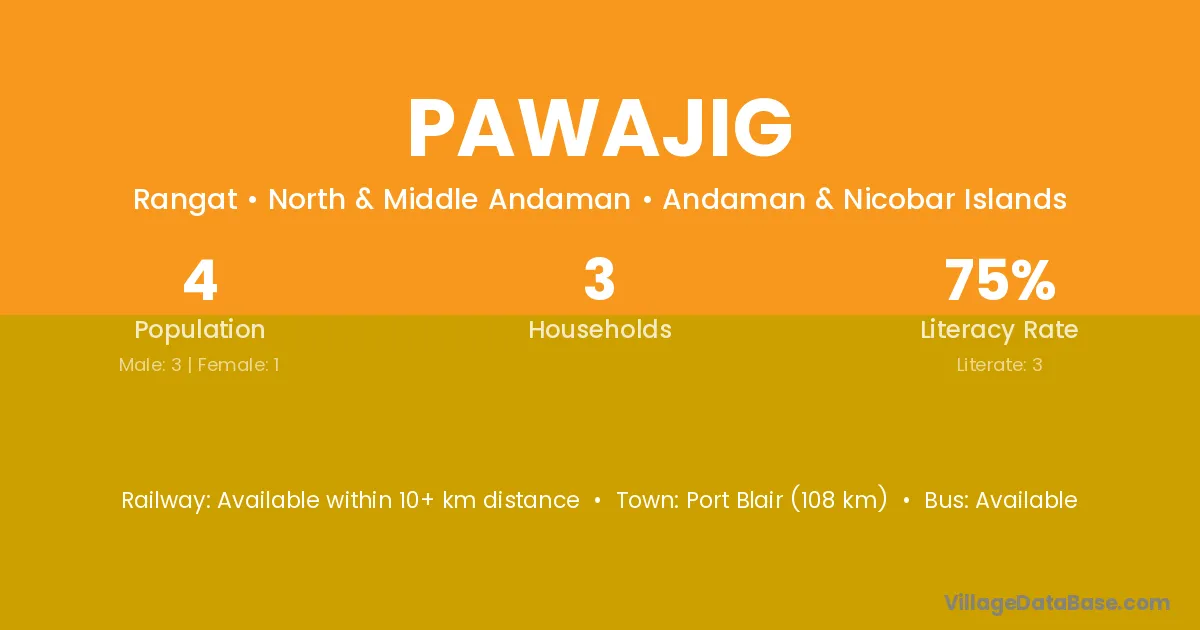 Port Blair (108 km) is the nearest town to Pawajig village for major economic activities and is located approximately 108 km away.