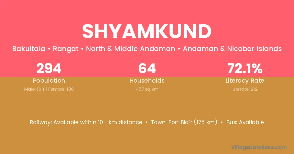 Port Blair (175 km) is the nearest town to Shyamkund village for major economic activities and is located approximately 175 km away.