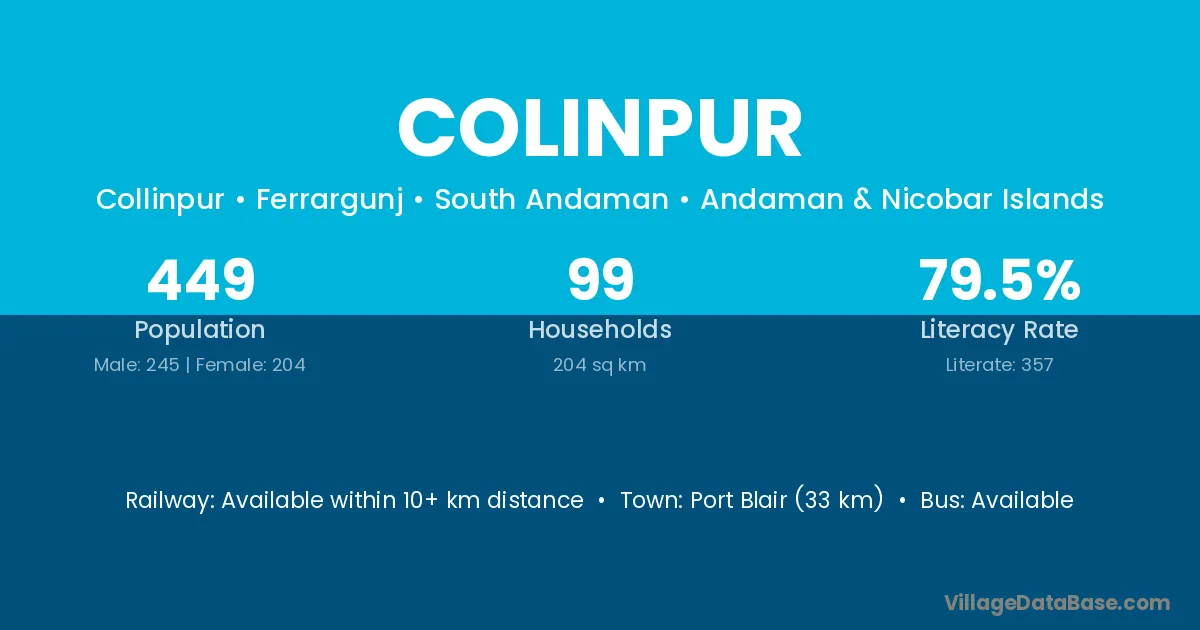Port Blair (33 km) is the nearest town to Colinpur village for major economic activities and is located approximately 33 km away.