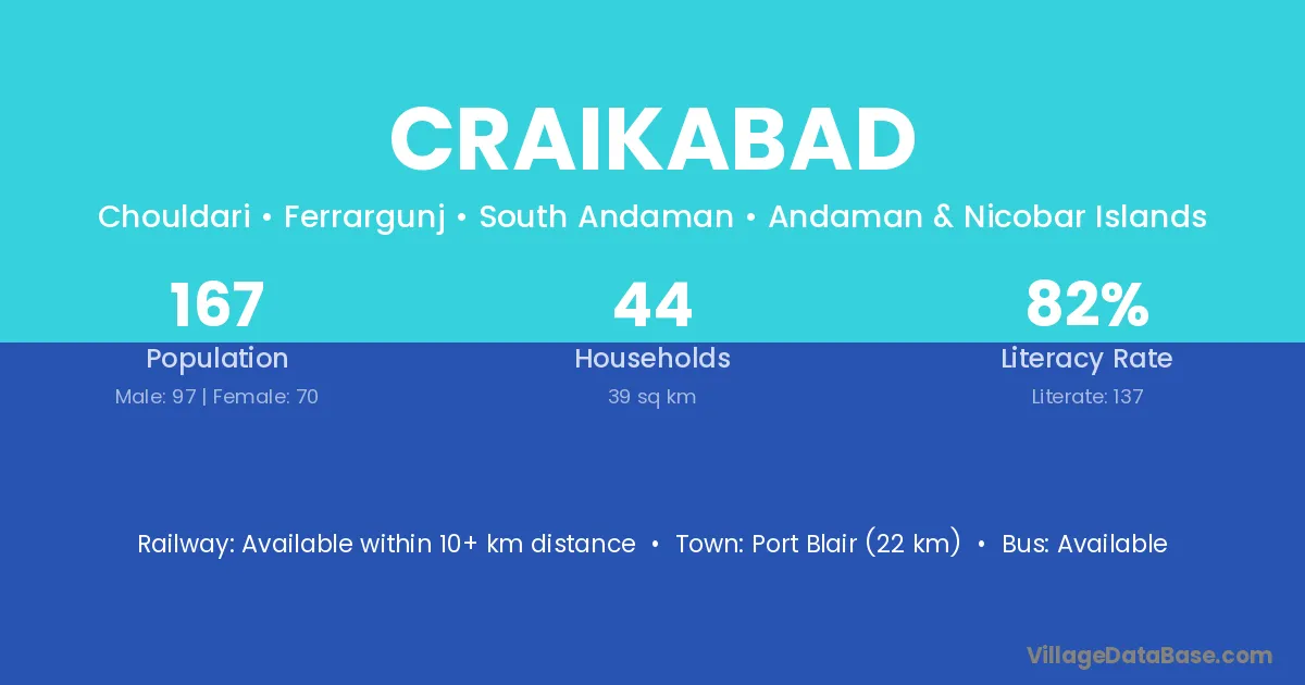 Port Blair (22 km) is the nearest town to Craikabad village for major economic activities and is located approximately 22 km away.