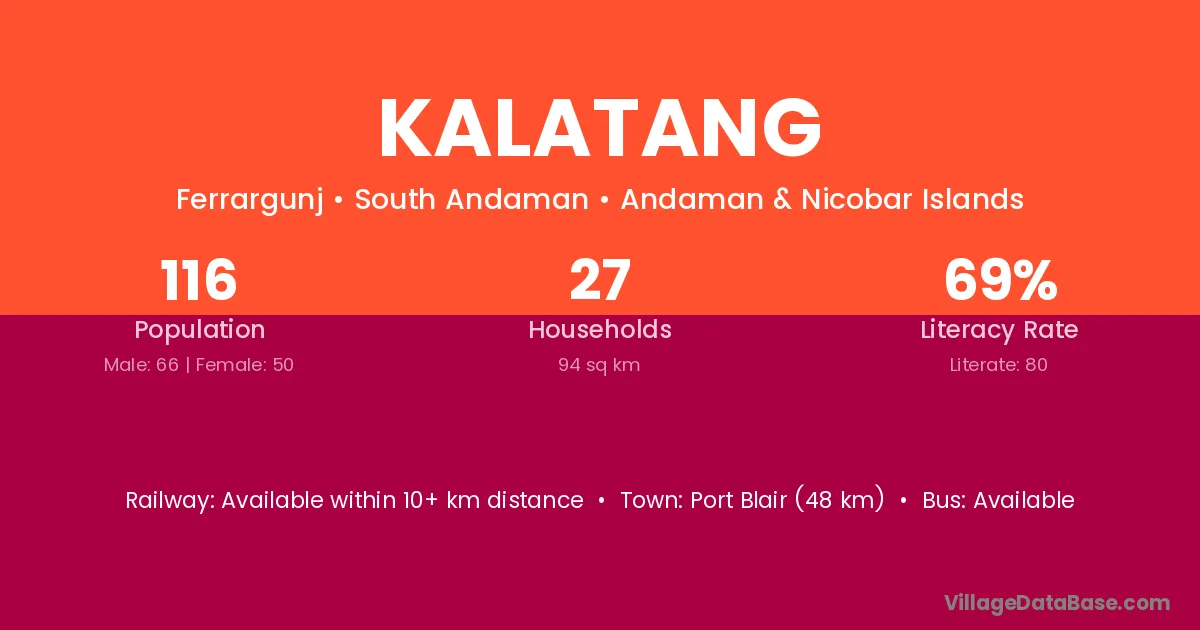 Port Blair (48 km) is the nearest town to Kalatang village for major economic activities and is located approximately 48 km away.