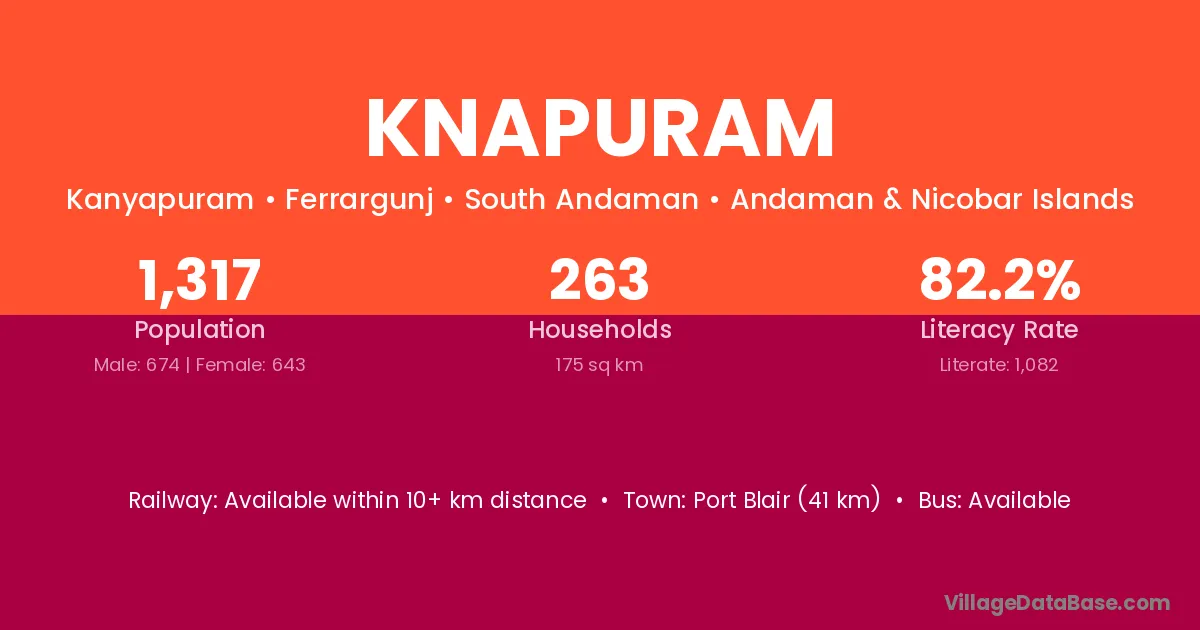 Port Blair (41 km) is the nearest town to Knapuram village for major economic activities and is located approximately 41 km away.