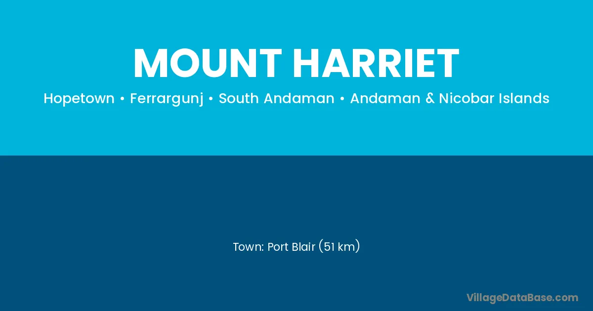 Port Blair (51 km) is the nearest town to Mount Harriet village for major economic activities and is located approximately 51 km away.