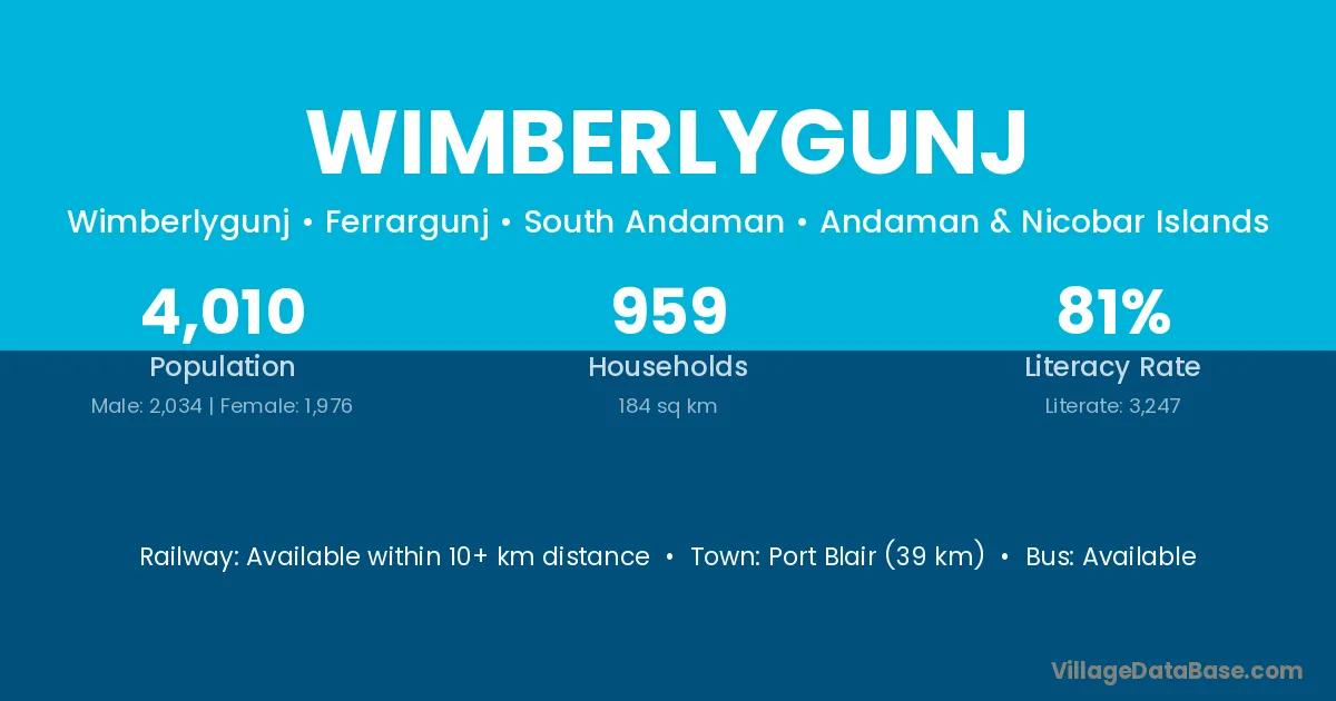 Port Blair (39 km) is the nearest town to Wimberlygunj village for major economic activities and is located approximately 39 km away.