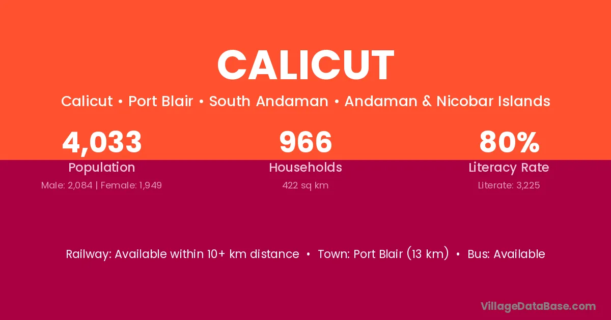 Port Blair (13 km) is the nearest town to Calicut village for major economic activities and is located approximately 13 km away.
