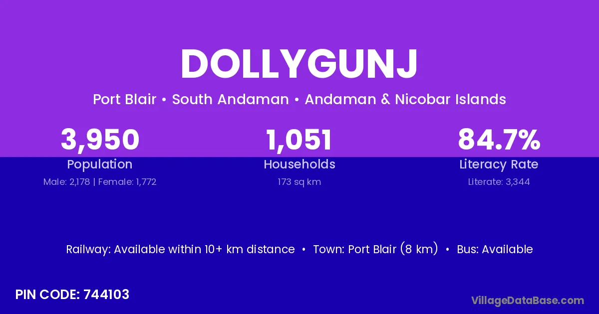 Port Blair (8 km) is the nearest town to Dollygunj village for major economic activities and is located approximately 8 km away.
