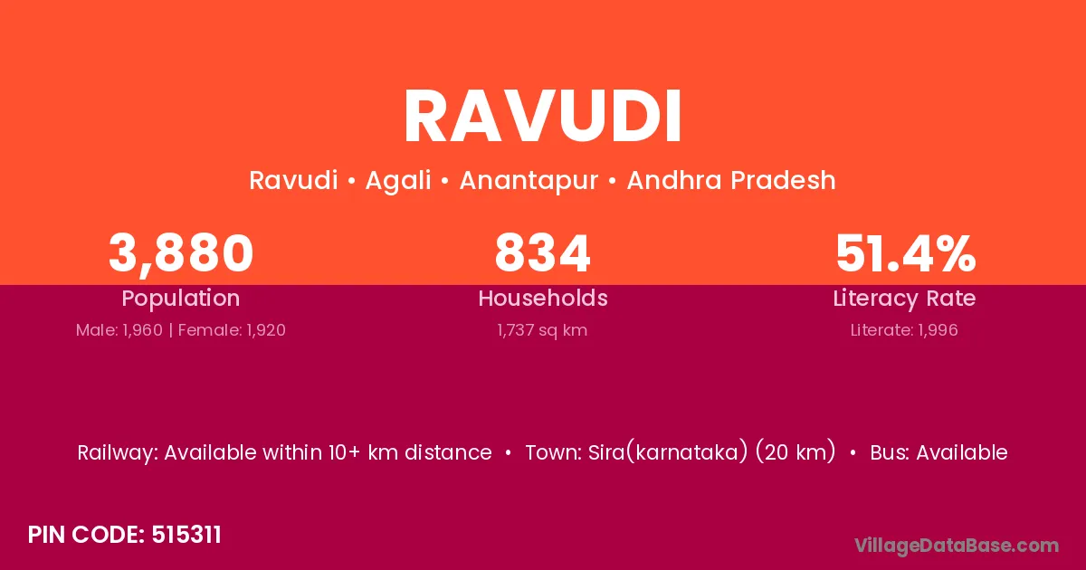 Sira(karnataka) (20 km) is the nearest town to Ravudi village for major economic activities and is located approximately 20 km away.