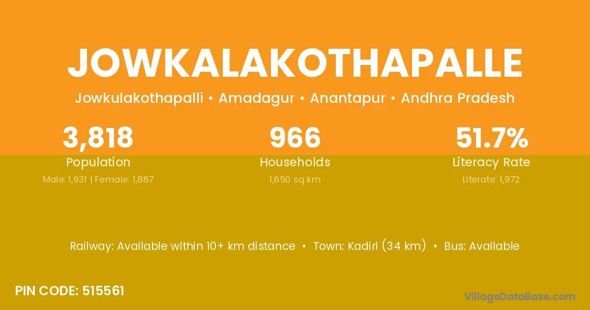 Kadiri (34 km) is the nearest town to Jowkalakothapalle village for major economic activities and is located approximately 34 km away.