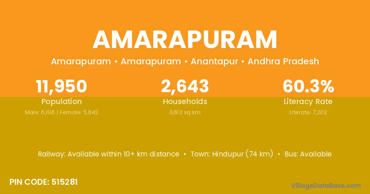 Amarapuram village has a total population of 11,950 people, of which 6,108 are males and 5,842 are females.