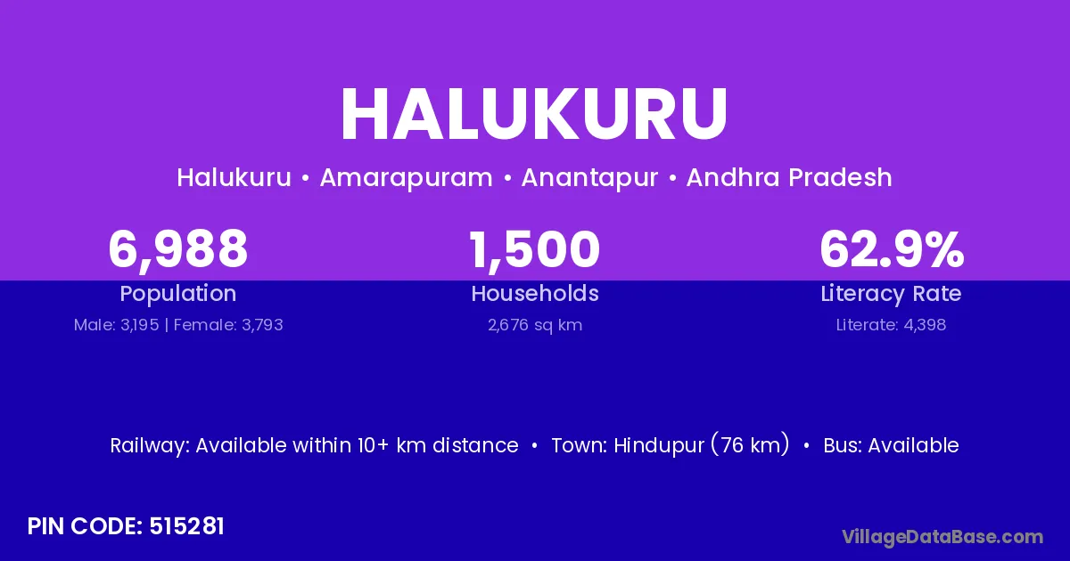Hindupur (76 km) is the nearest town to Halukuru village for major economic activities and is located approximately 76 km away.