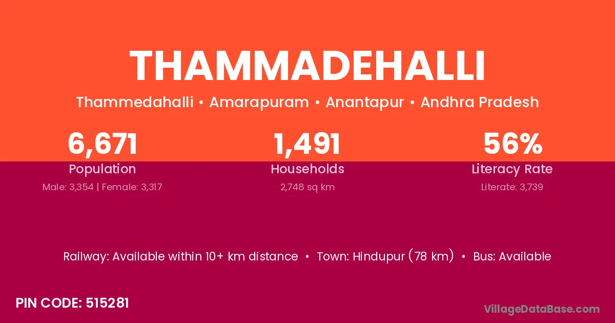 Hindupur (78 km) is the nearest town to Thammadehalli village for major economic activities and is located approximately 78 km away.