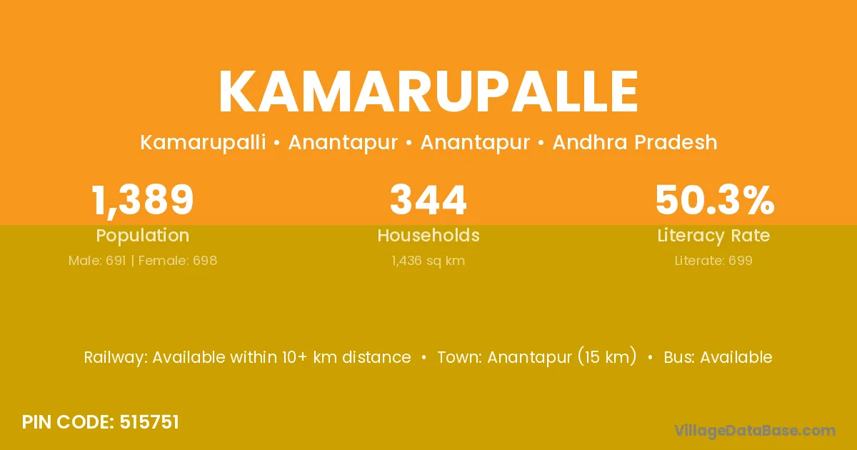 Anantapur (15 km) is the nearest town to Kamarupalle village for major economic activities and is located approximately 15 km away.