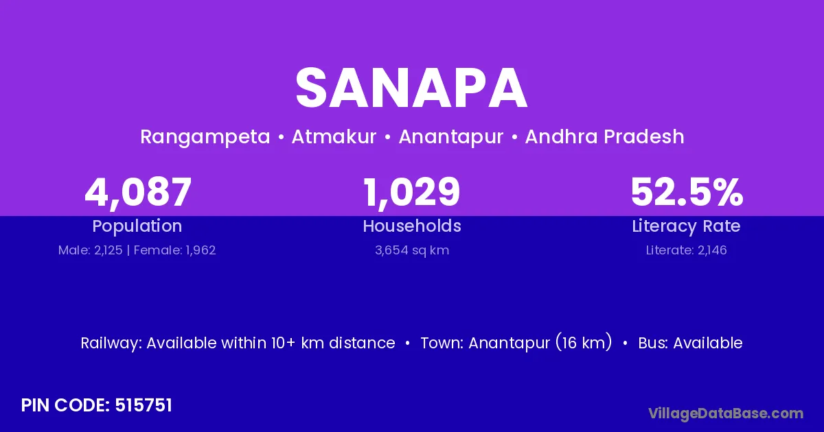 Anantapur (16 km) is the nearest town to Sanapa village for major economic activities and is located approximately 16 km away.