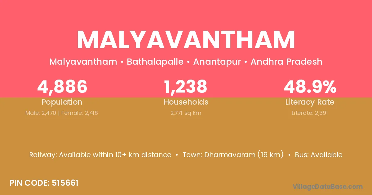 Dharmavaram (19 km) is the nearest town to Malyavantham village for major economic activities and is located approximately 19 km away.