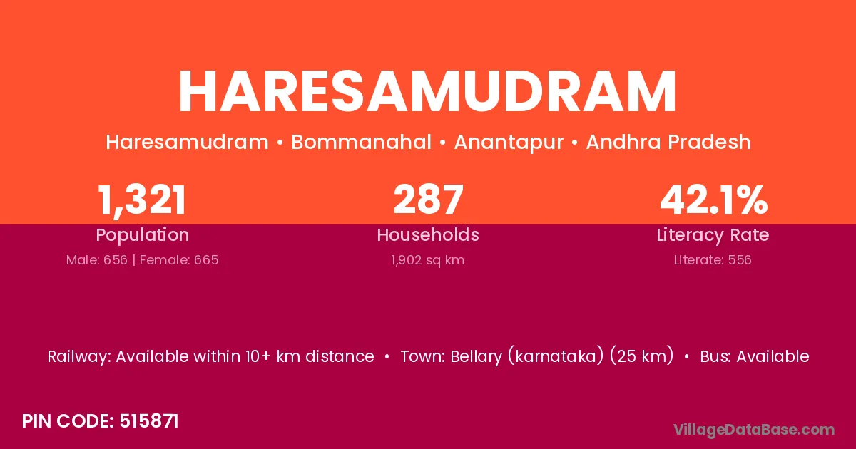 Haresamudram village has a total population of 1,321 people, of which 656 are males and 665 are females.
