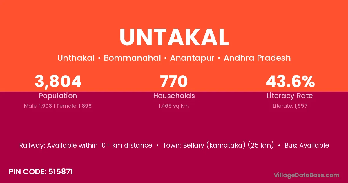 Bellary (karnataka) (25 km) is the nearest town to Untakal village for major economic activities and is located approximately 25 km away.