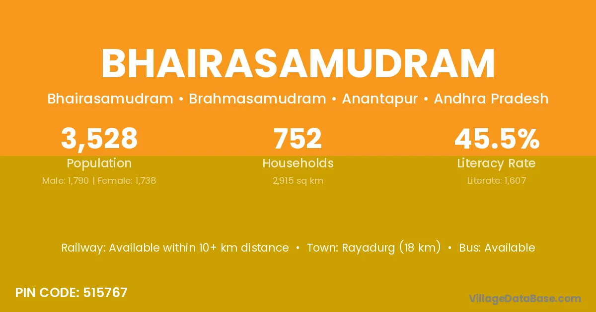 Rayadurg (18 km) is the nearest town to Bhairasamudram village for major economic activities and is located approximately 18 km away.