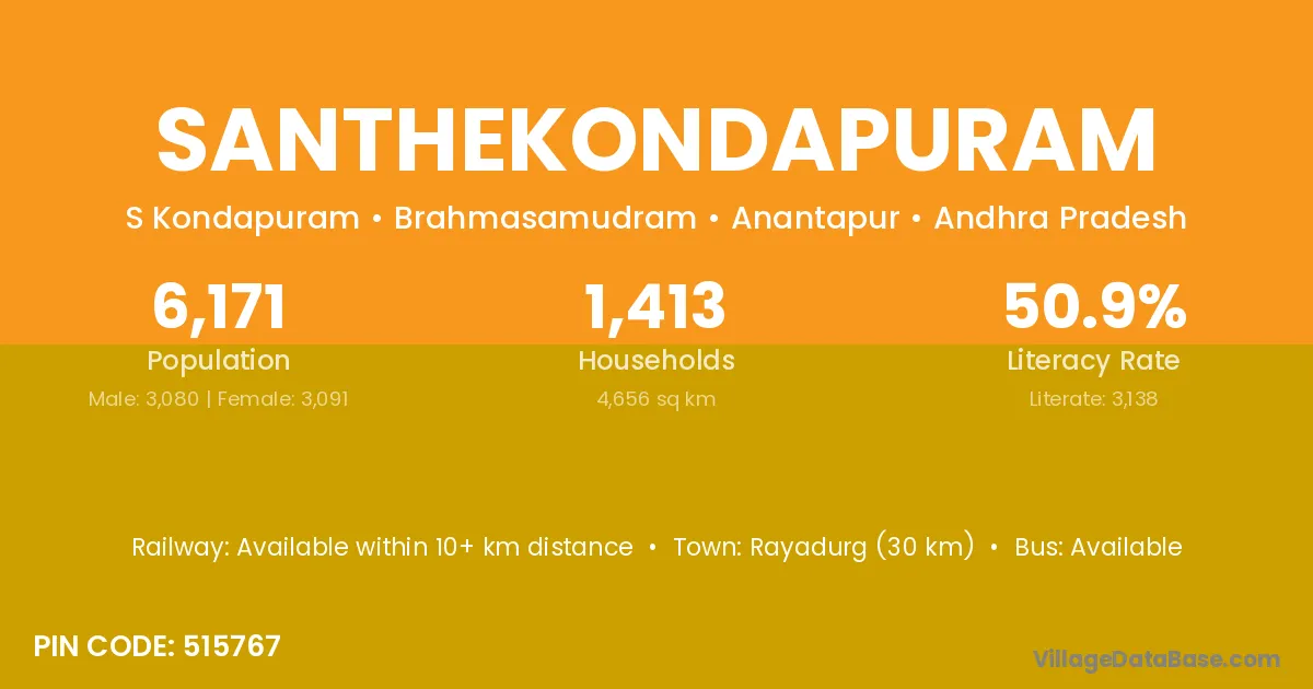 Santhekondapuram village has a total population of 6,171 people, of which 3,080 are males and 3,091 are females.