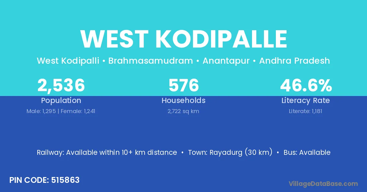 Rayadurg (30 km) is the nearest town to West Kodipalle village for major economic activities and is located approximately 30 km away.
