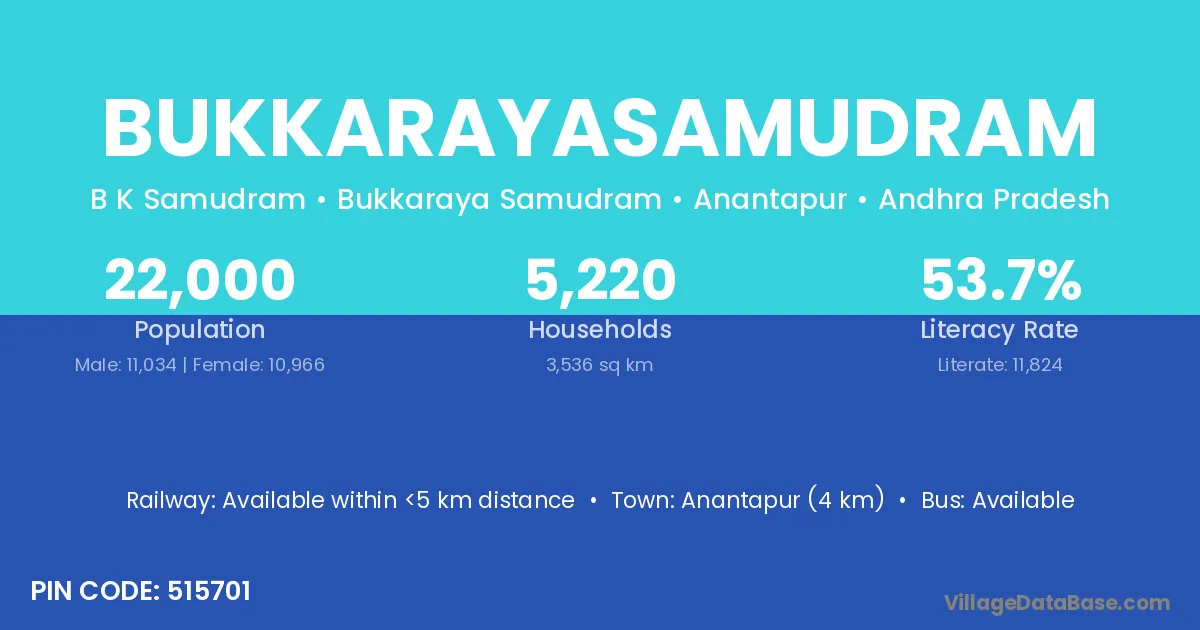 Bukkarayasamudram village has a total population of 22,000 people, of which 11,034 are males and 10,966 are females.