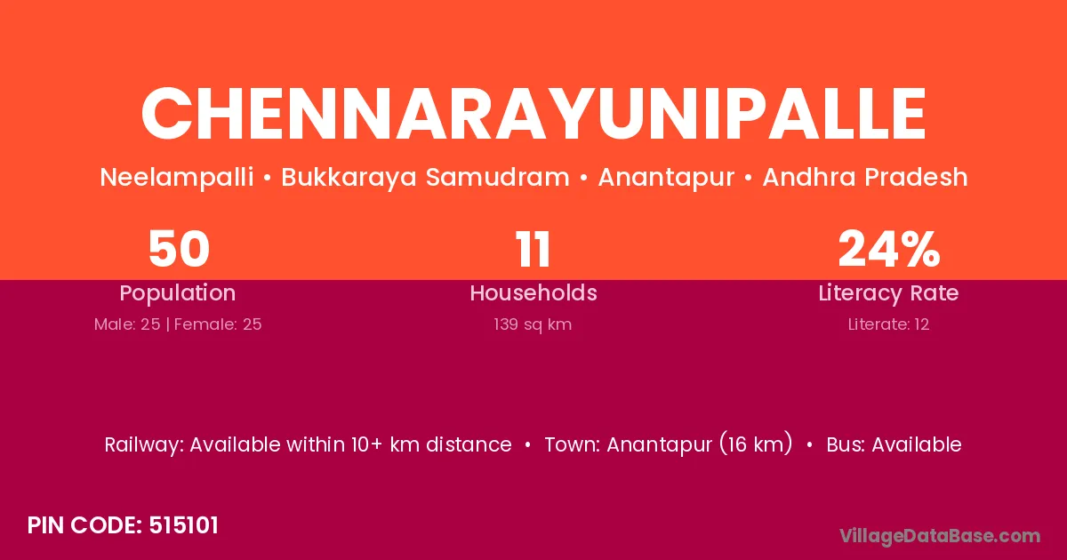Chennarayunipalle village has a total population of 50 people, of which 25 are males and 25 are females.