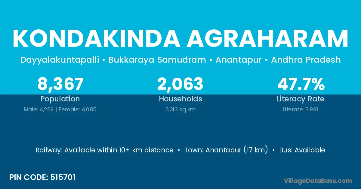 Anantapur (17 km) is the nearest town to Kondakinda Agraharam village for major economic activities and is located approximately 17 km away.