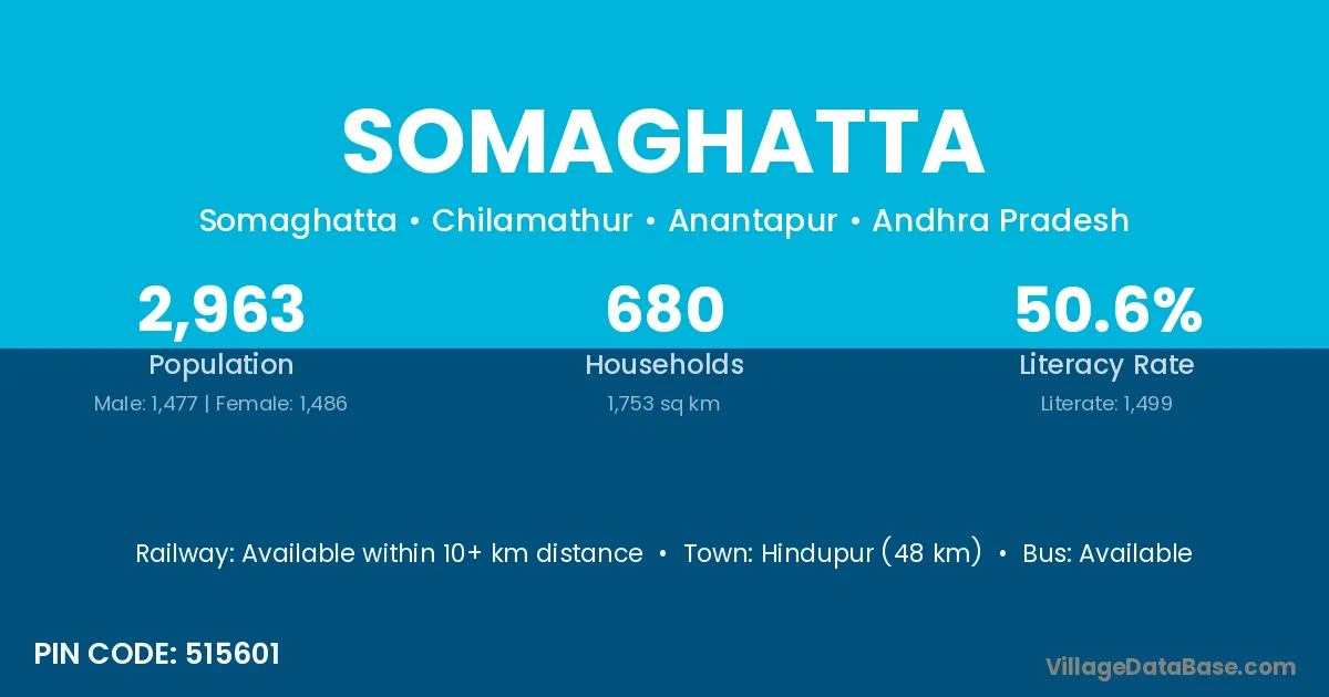 Hindupur (48 km) is the nearest town to Somaghatta village for major economic activities and is located approximately 48 km away.