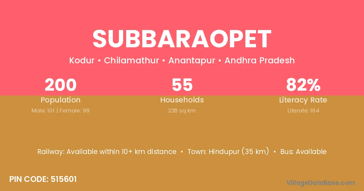 Subbaraopet village has a total population of 200 people, of which 101 are males and 99 are females.