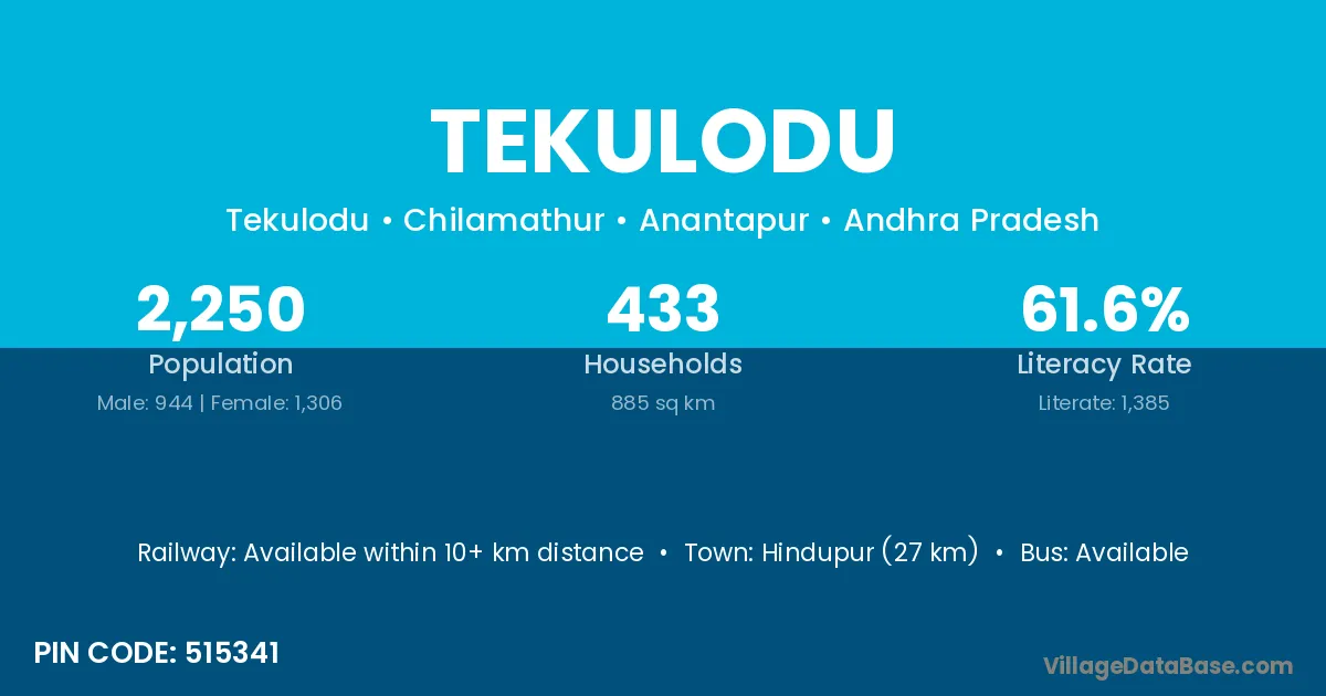 Hindupur (27 km) is the nearest town to Tekulodu village for major economic activities and is located approximately 27 km away.