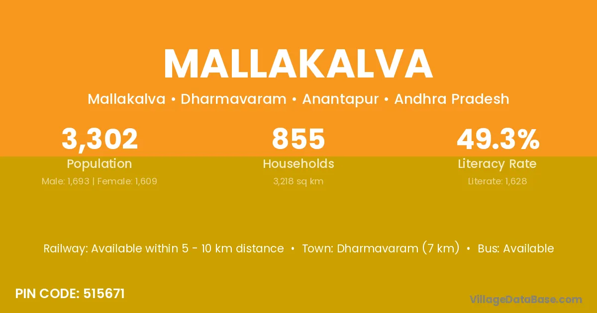 Dharmavaram (7 km) is the nearest town to Mallakalva village for major economic activities and is located approximately 7 km away.